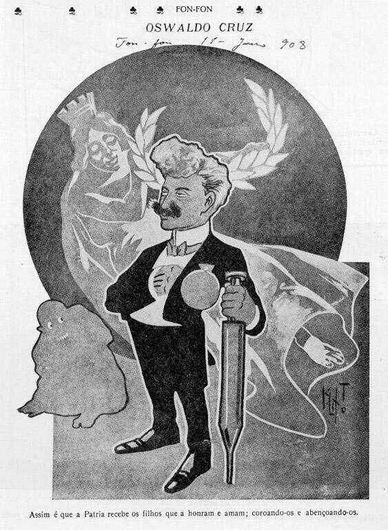 Charge sobre Oswaldo Cruz e sua premiação na Exposição Internacional de Higiene em Berlim. Revista Fon-Fon. Imprensa Nacional