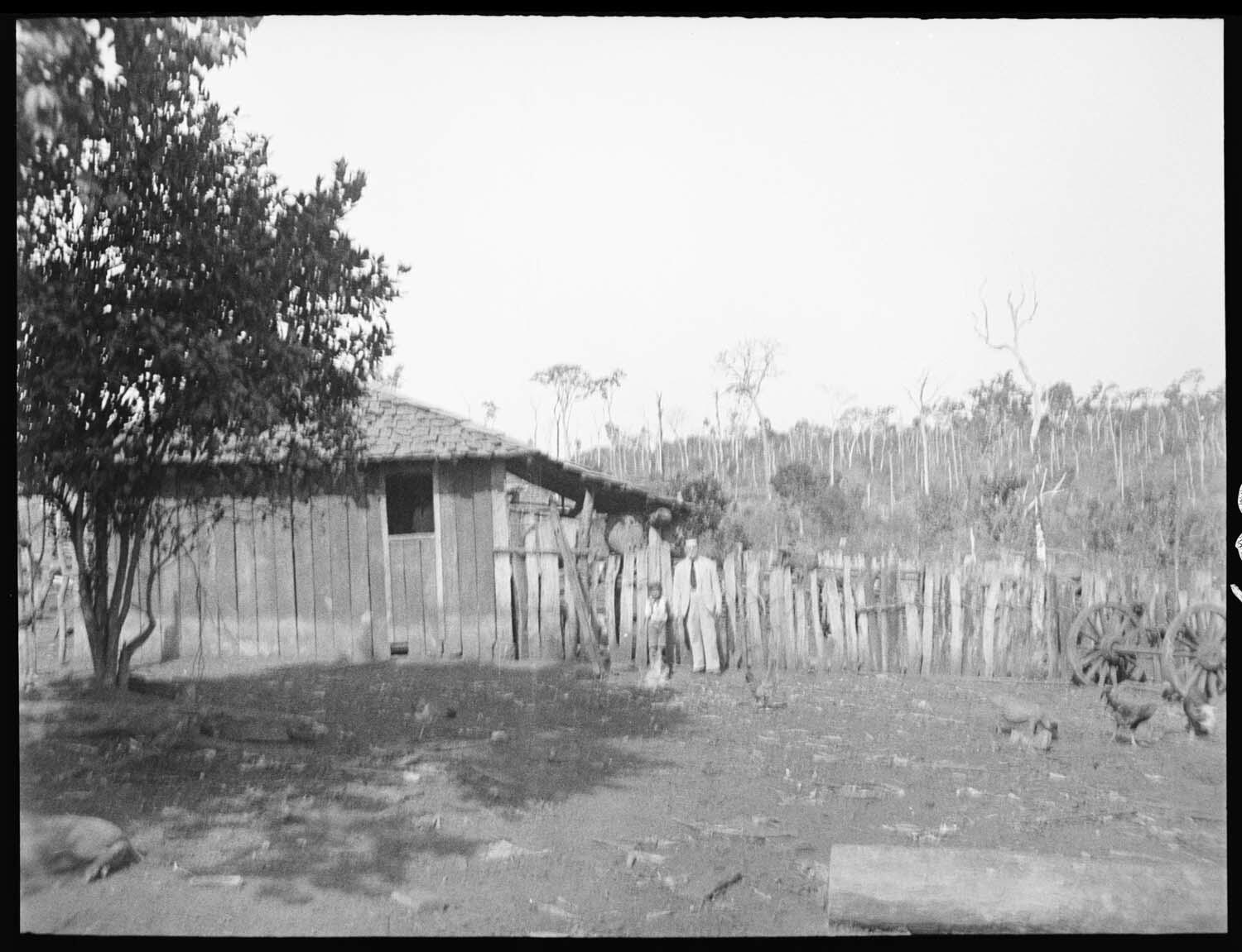 Dr. Serafim com criança em frente à uma casa no sítio Fausto em Cambará (PR)