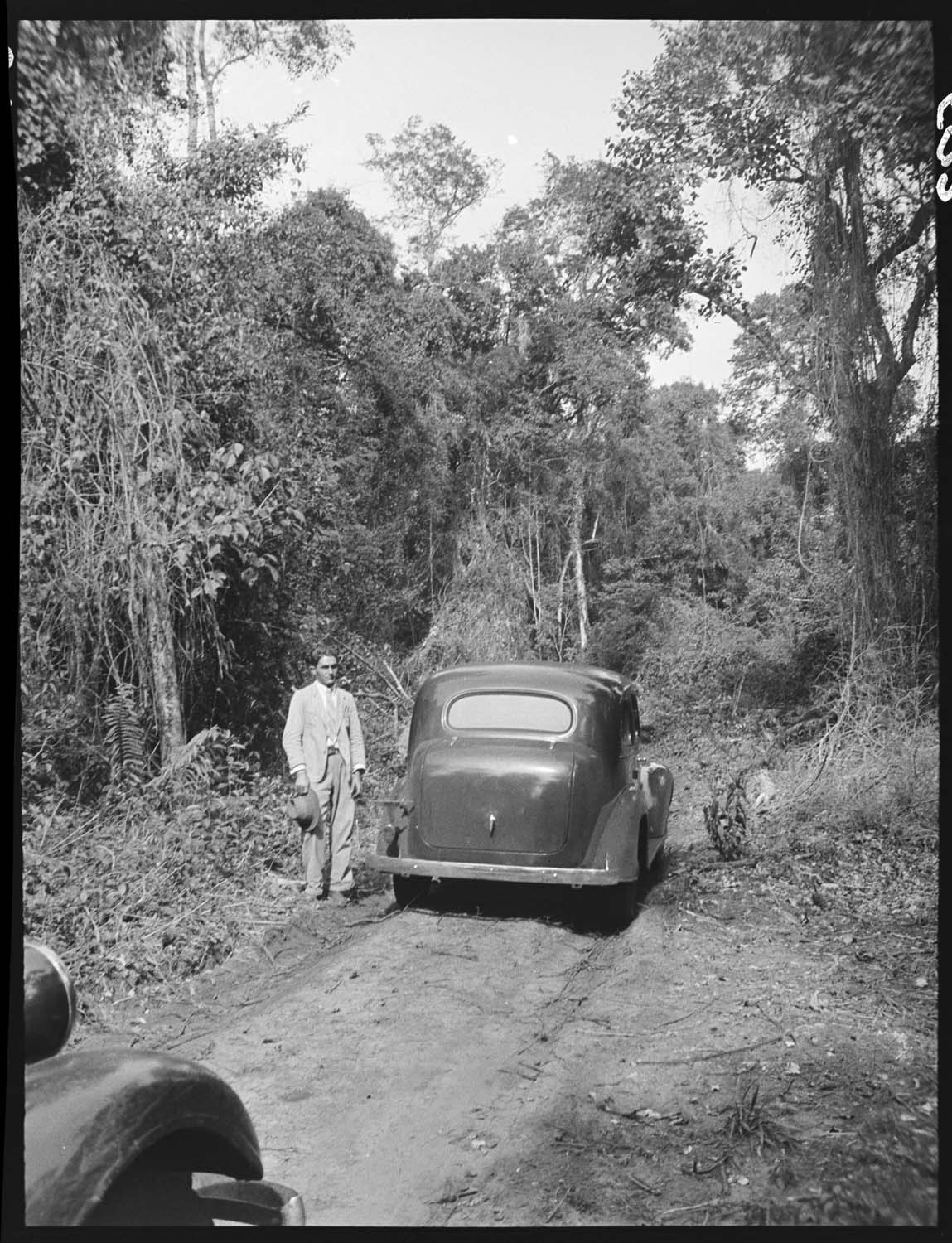 Foto em preto e branco. Uma estrada de terra em uma floresta. À esquerda, o pedaço da parte frontal de um carro. De frente para o carro, à esquerda, um homem de pé. Cabelos curtos, paletó, camisa, gravata, cinto, calça e sapatos. Na mão direita, um chapéu. À direita do homem, um carro com a traseira virada para nós. Atrás, vegetação alta e árvores.