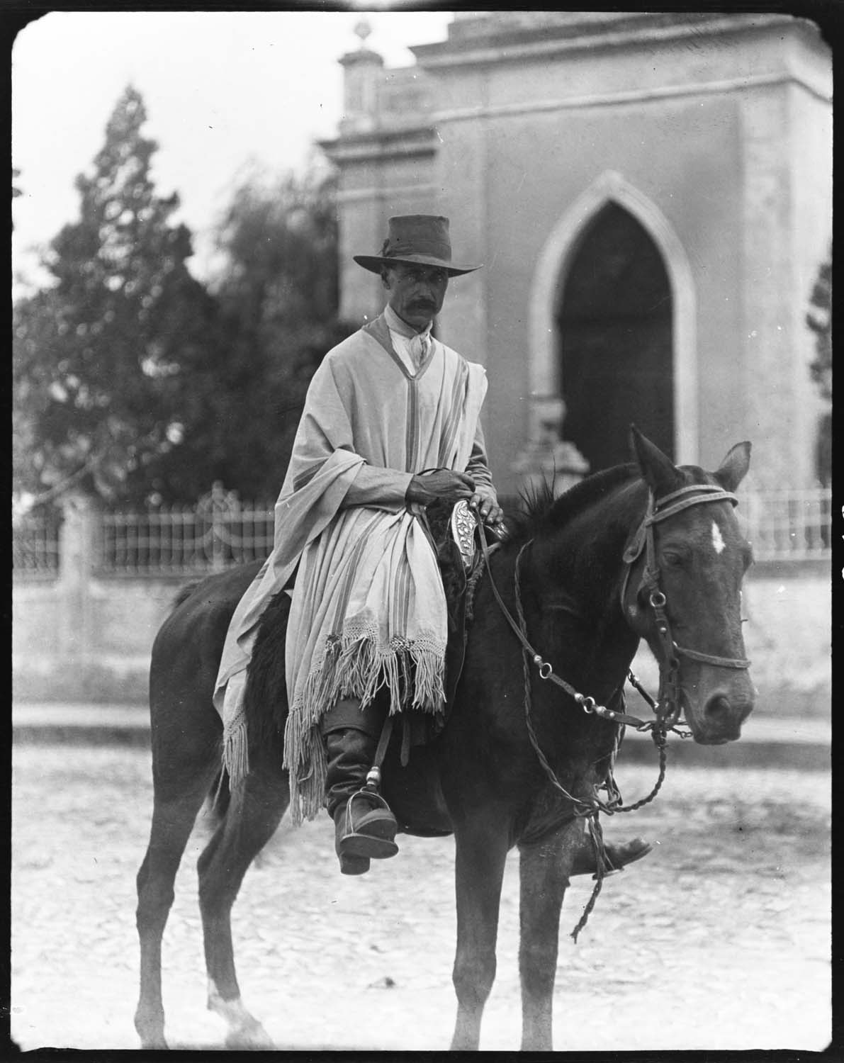 Foto em preto e branco. Em uma rua, um homem de perfil montado em um cavalo. O homem usa chapéu, camisa de mangas compridas, lenço no pescoço, poncho e botas de cano alto. As mãos nas rédeas do cavalo. O pé direito no estribo, preso à cela. Atrás do homem, um muro. Atrás do muro, à esquerda, vegetação alta. À direita, uma casa com uma porta na frente.