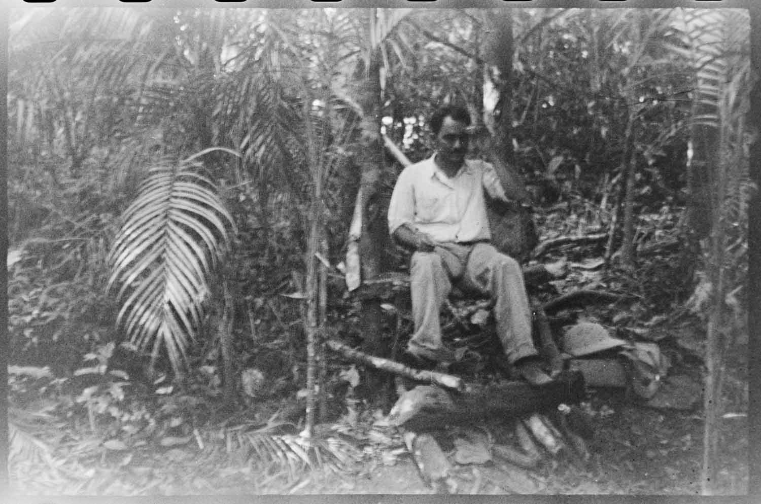 Foto em preto e branco. Numa floresta, um homem sentado sobre troncos de árvores. O homem tem cabelos curtos, usa camisa de mangas compridas dobradas até os cotovelos, calça e sapatos. O braço direito sobre a perna direita. A mão esquerda na testa.