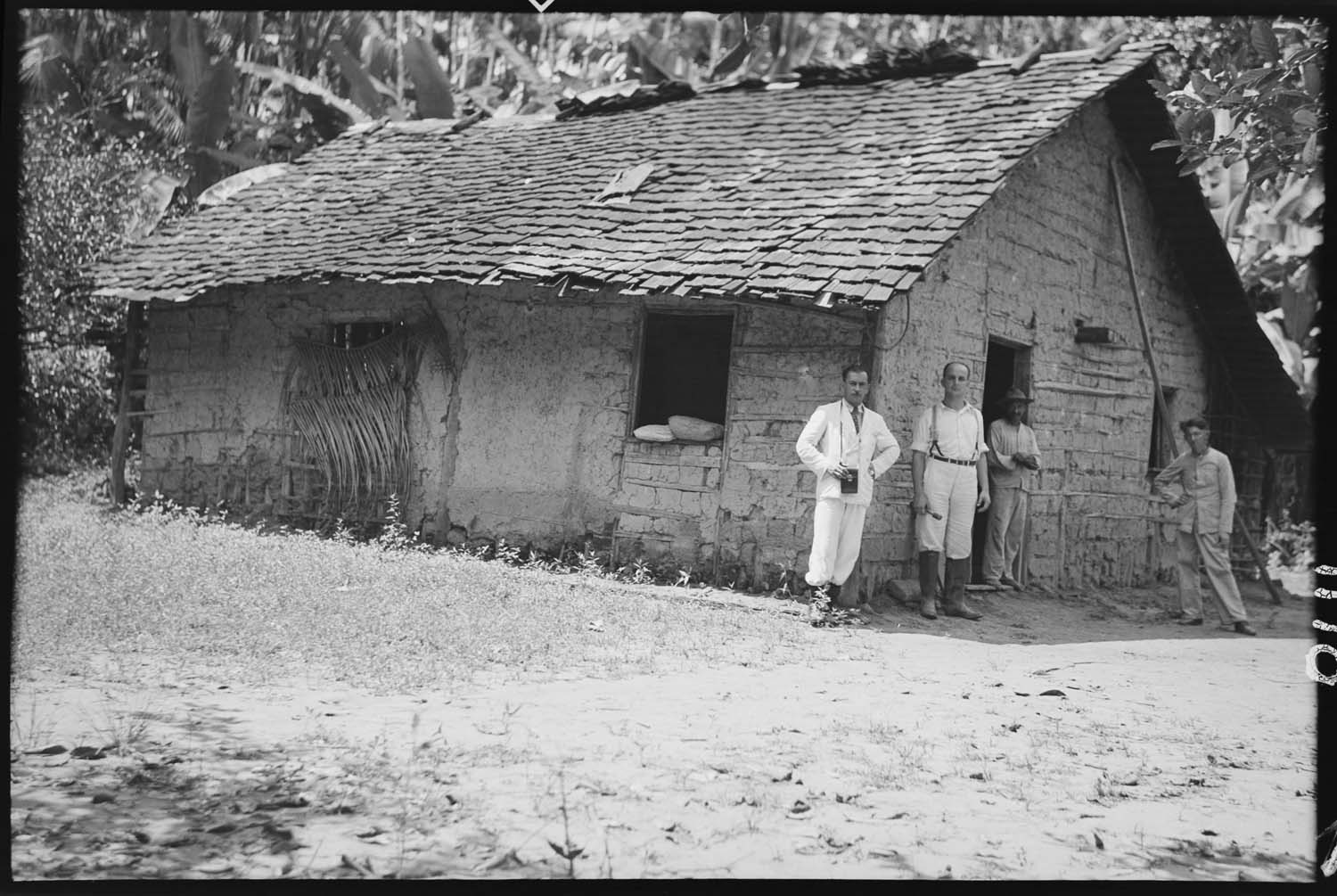 Foto em preto e branco. Em um campo de terra batida, três homens de pé. O da esquerda é branco, cabelos curtos, camisa, gravata, paletó, calça, botas de cano alto, mão direita numa bolsa, pendurada no pescoço, a mão esquerda na cintura. À direita, outro homem, branco, calvo, camisa de mangas compridas dobradas até os cotovelos, suspensórios, cinto, calça, botas de cano alto. À direita, um homem branco, cabelos curtos, de uniforme, paletó, calça, sapatos, a mão direita na cintura. Atrás, uma casa de pau a pique, com duas janelas na lateral esquerda, uma porta aberta, com um homem de pé. É pardo, de chapéu, camisa de mangas compridas, calça, descalço. À direita, uma janela. Ao fundo, floresta.