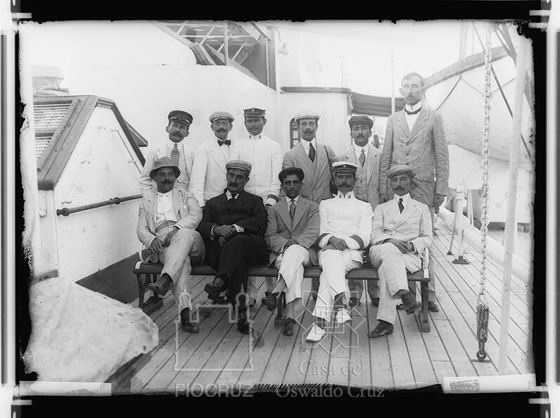 Grupo da comissão de bordo do Rio de Janeiro: Carlos Chagas, Pacheco Leão e João Pedroso posando ao lado da tripulação do navio