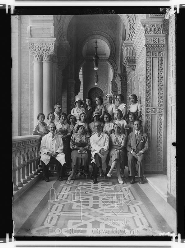 Visitantes e pesquisadores do IOC. Da esquerda para direita: Leocádio Chaves, secretário do instituto, o terceiro, Carlos Chagas, diretor do IOC, e a terceira fila, Souza Araújo, chefe do laboratório de leprologia