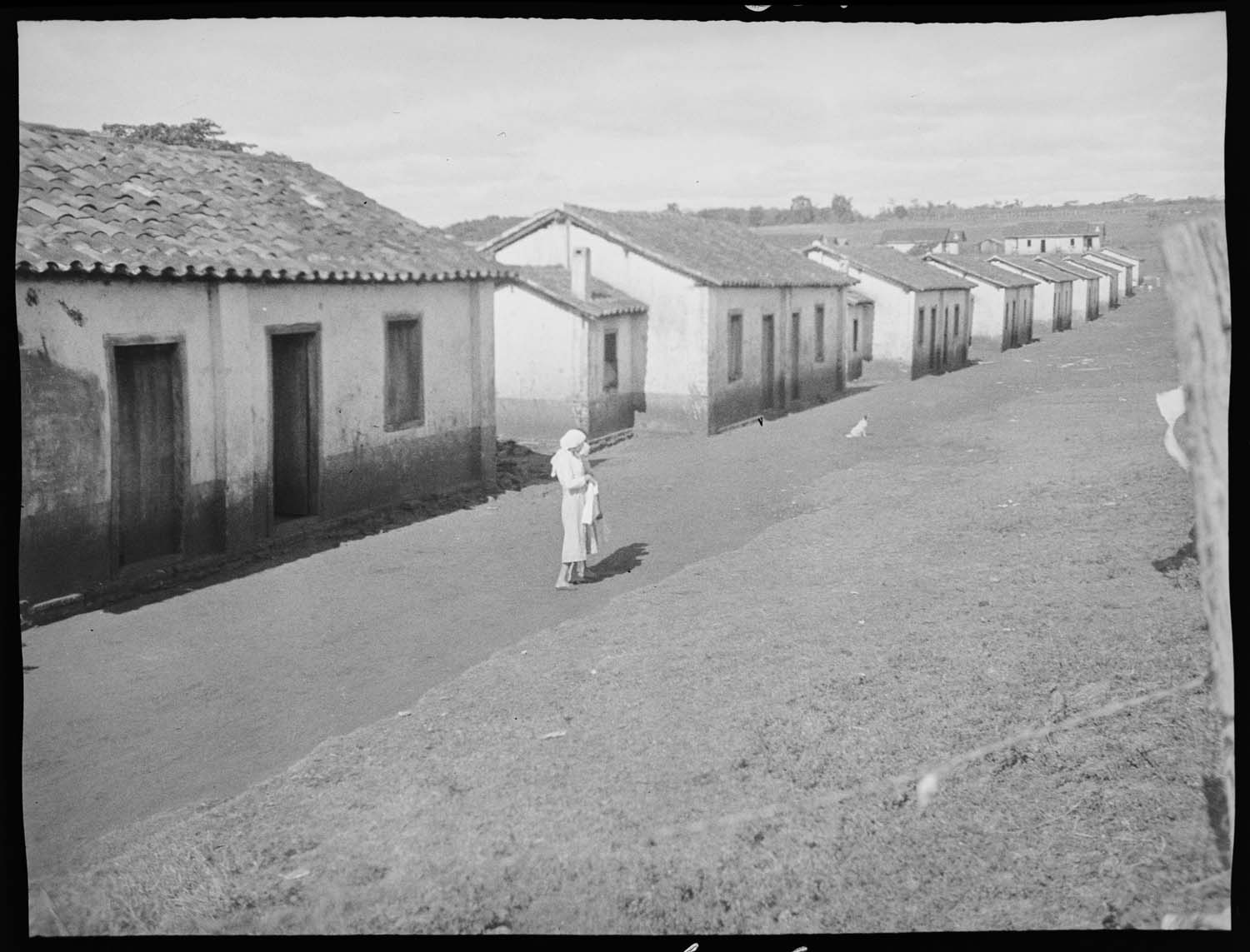 Mulher em frente a casas de trabalhadores da Fazenda Cayua - Cambará (PR)