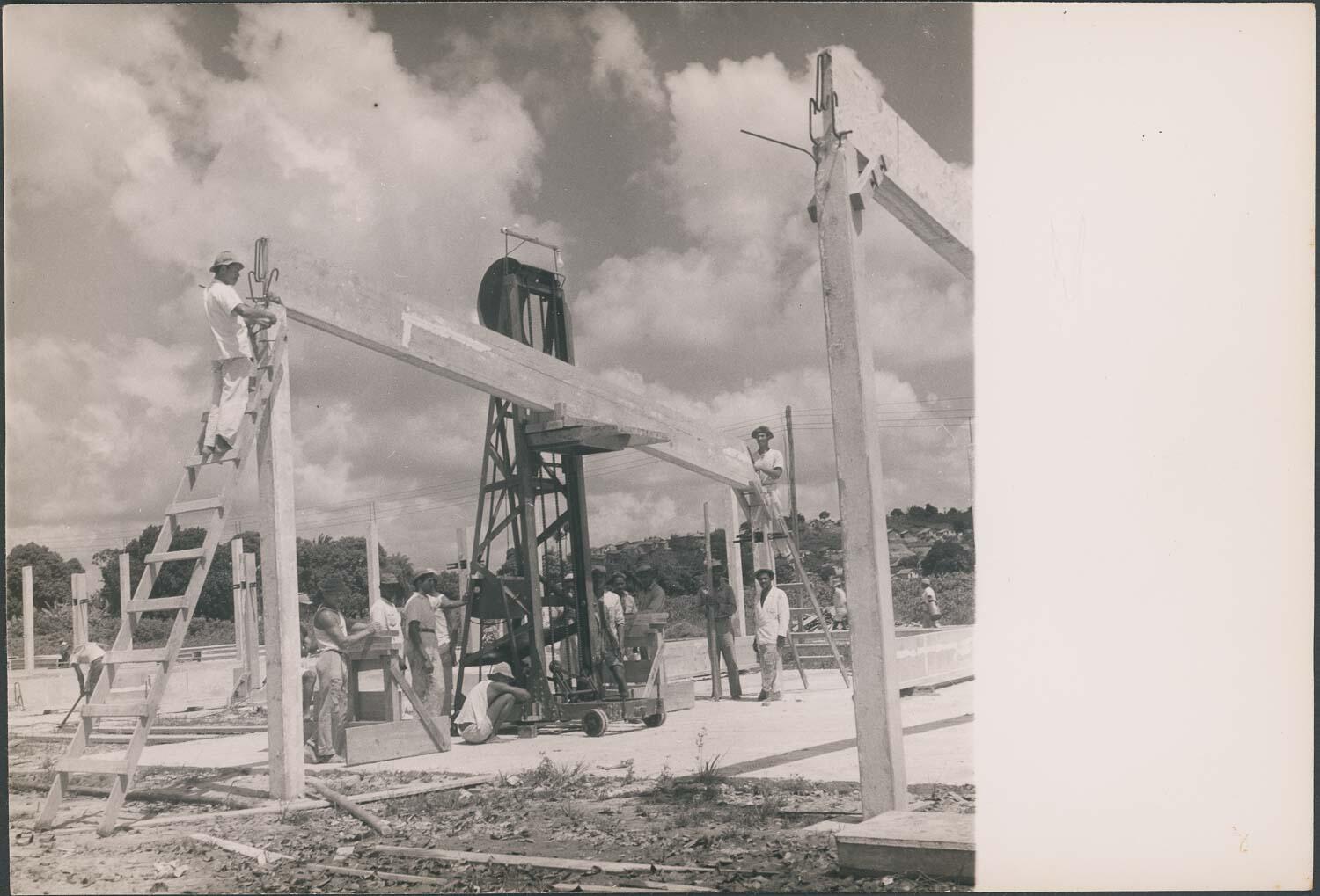 Operários instalando uma viga com uma empilhadeira elétrica nas obras do Sanatório de Sancho