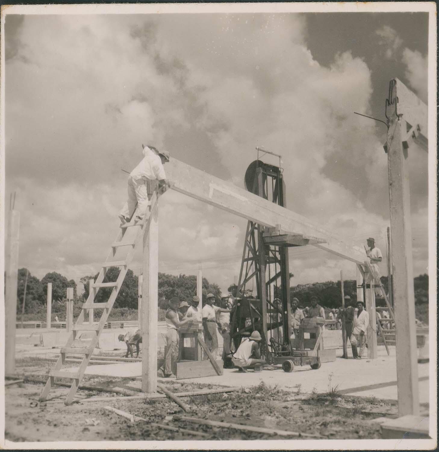 Operários instalando uma viga com uma empilhadeira elétrica nas obras do Sanatório de Sancho