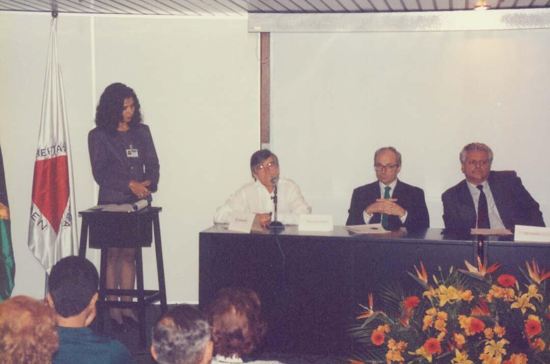Palestrantes, composição da mesa da esquerda para a direita: pesquisador não identificado, Jean-Pierre Dedet, Eloi Garcia