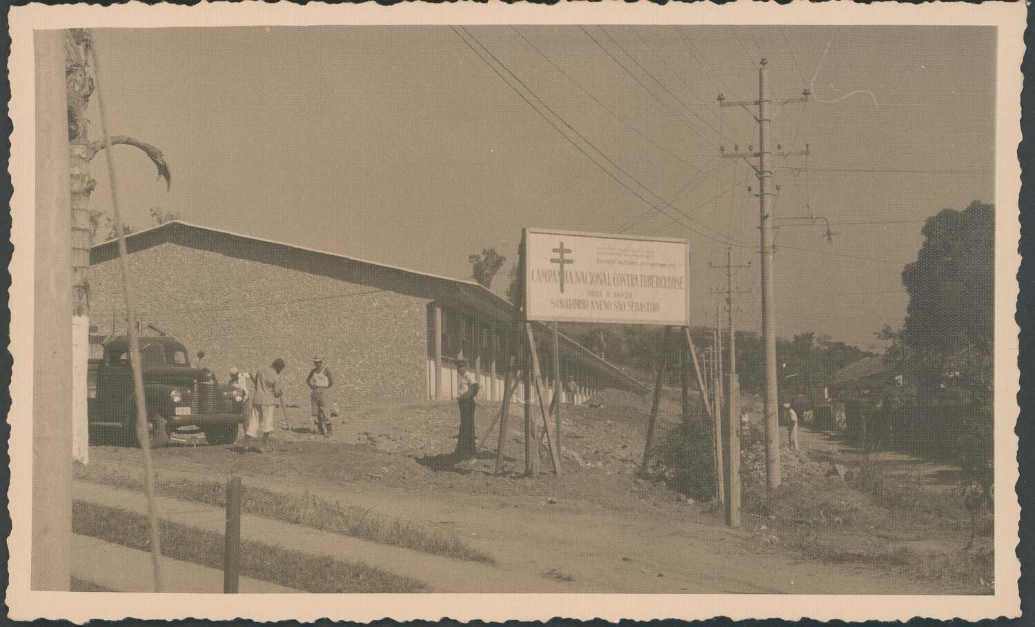 Pavilhão do Sanatório de São Sebastião, destaque para a placa identificando a obra da CNT