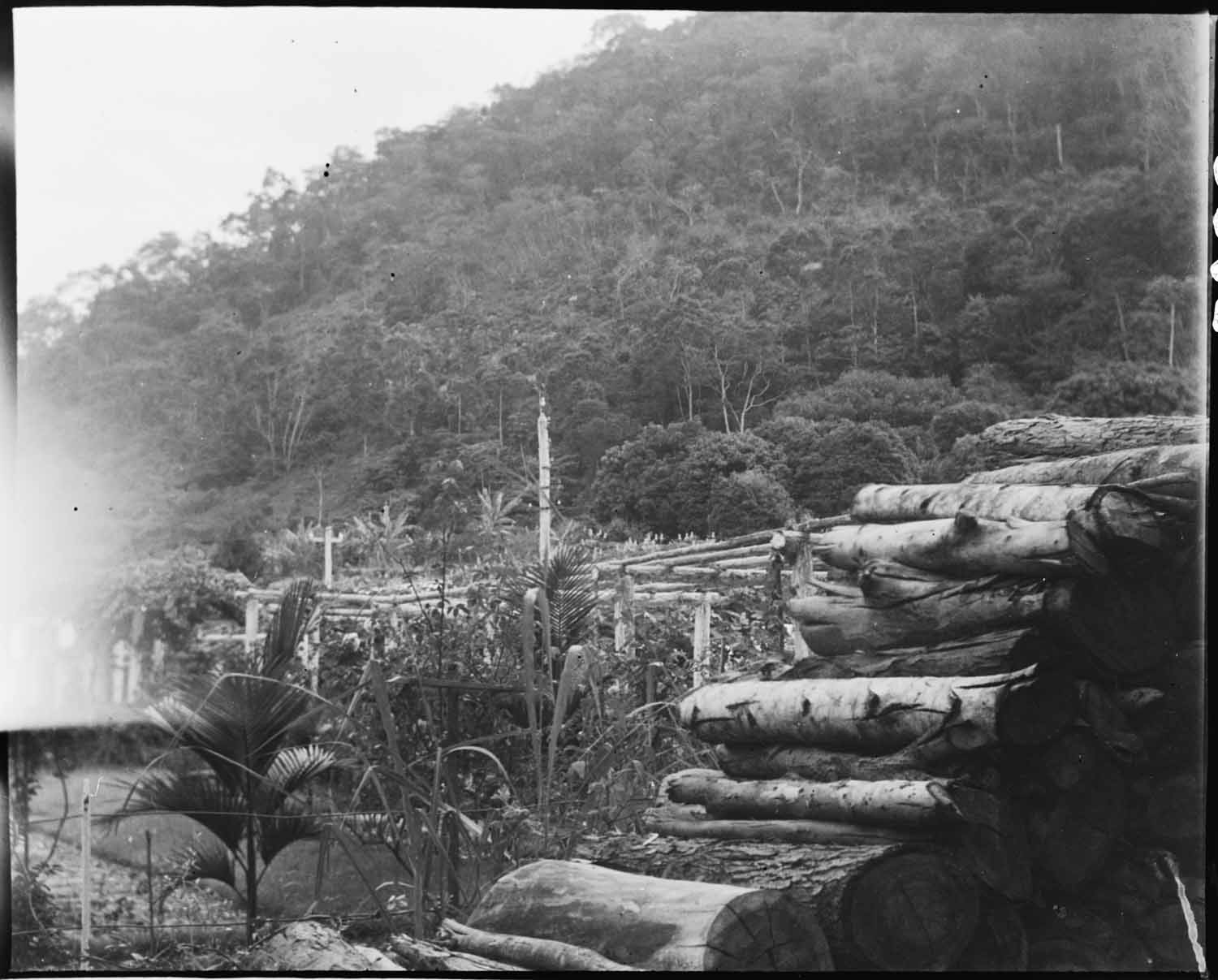 Toras de madeira com mata ao fundo na Fazenda Cachoeiras - Teresópolis (RJ)