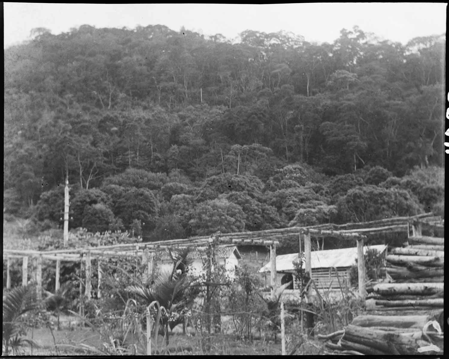 Foto em preto e branco. Um campo gramado, com vegetação alta. No centro, um caramanchão: estrutura de madeira, em forma de túnel, feita para sustentar plantas trepadeiras. À direita do caramanchão, uma pilha de troncos de árvores cortados. Atrás, num terreno elevado, uma floresta.
