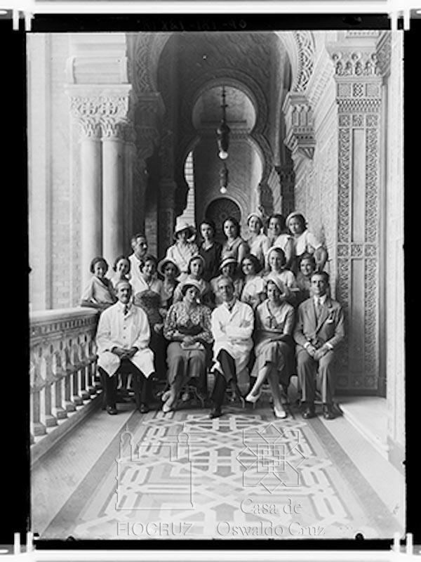 Visitantes e pesquisadores do IOC. Da esquerda para direita: Leocádio Chaves, secretário do instituto, o terceiro, Carlos Chagas, diretor do IOC, e a terceira fila, Souza Araújo, chefe do laboratório de leprologia
