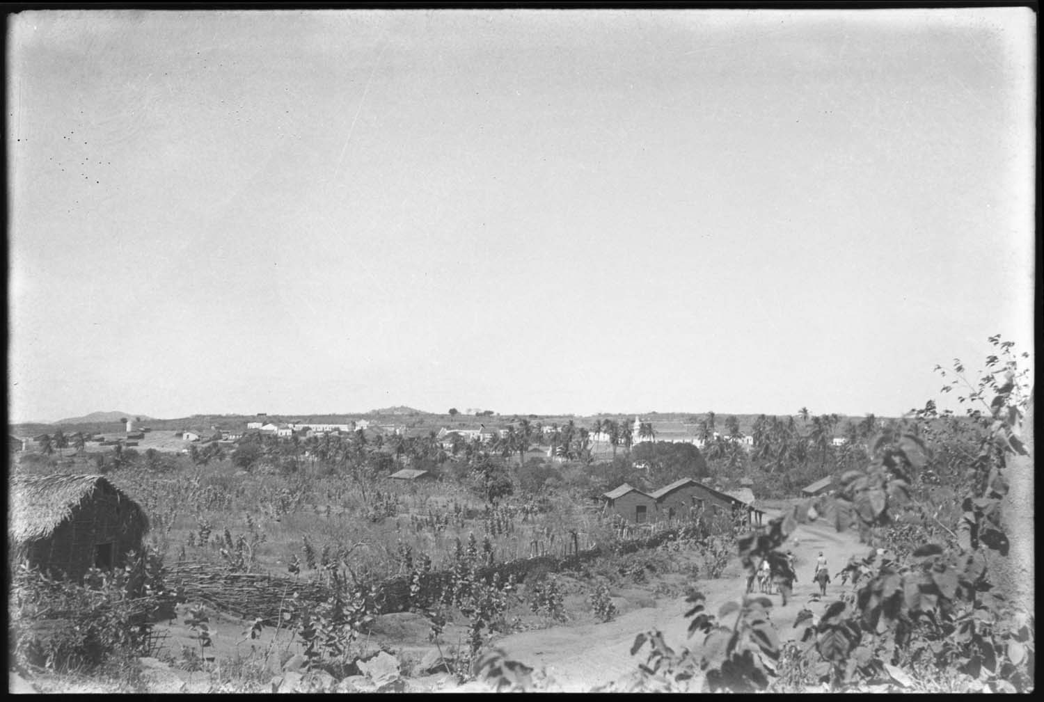 Foto em preto e branco. Uma estrada de terra. À direita, algumas pessoas montadas em cavalos, de costas para nós. Na margem esquerda da estrada, uma casa com telhado de palha. À direita da casa, outra casa. Atrás, vegetação alta, árvores e coqueiros. Atrás dos coqueiros, telhados de casas e prédios. Ao fundo, montanhas.
