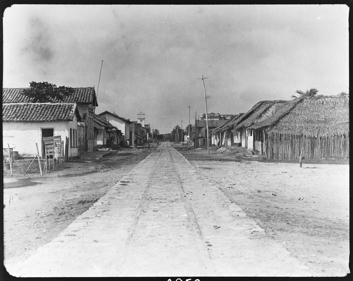 Foto em preto e branco. Uma rua com chão de terra. Do lado esquerdo, várias casas, uma ao lado da outra, e algumas pessoas de pé. À direita, do outro lado da rua, alguns postes. À direita dos postes, várias casas, uma ao lado da outra. Ao fundo, árvores e uma montanha.